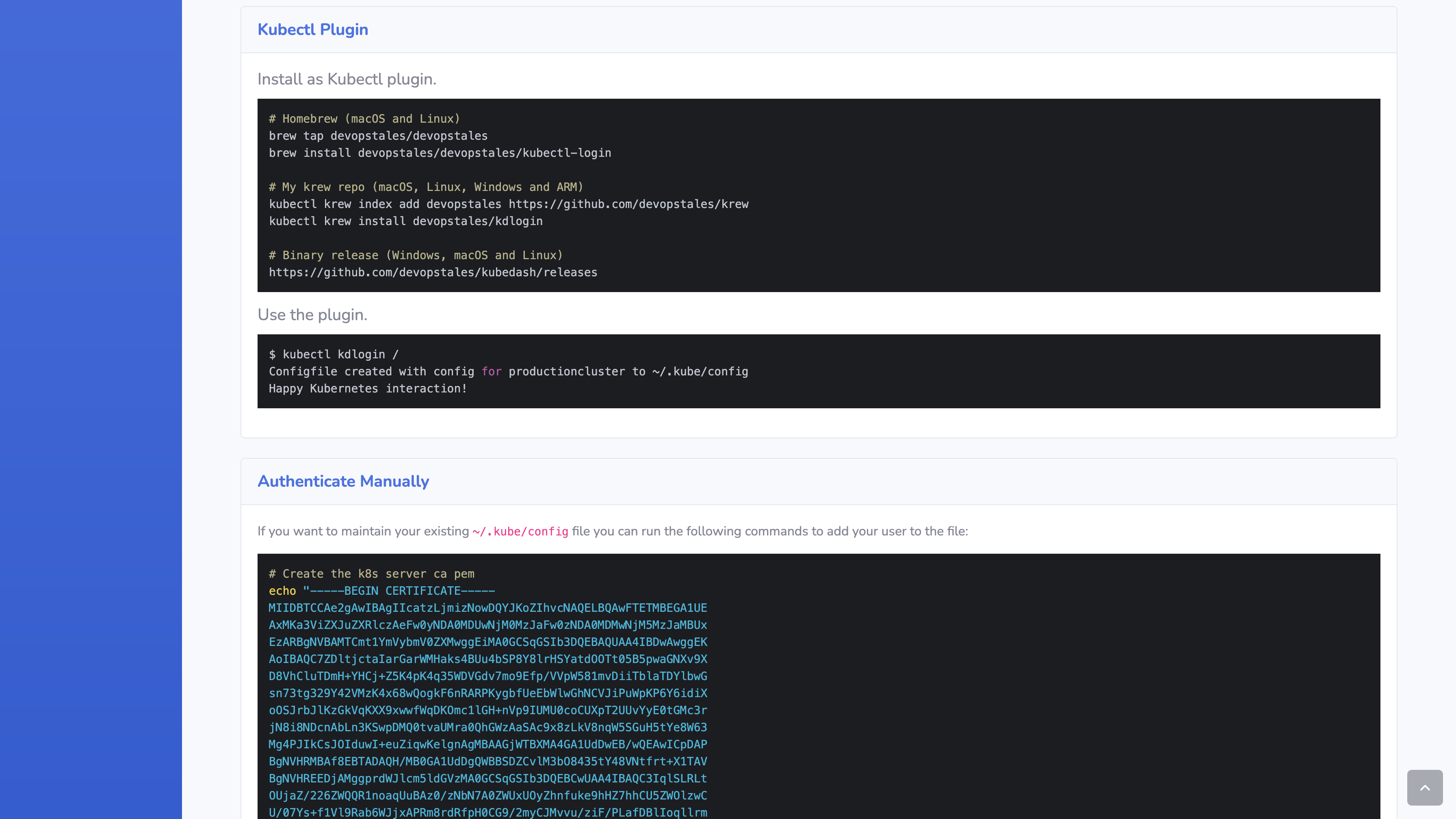 - The local users gat a config for with certificate based authentication. The KubeDash Dashboard generates the certificate.