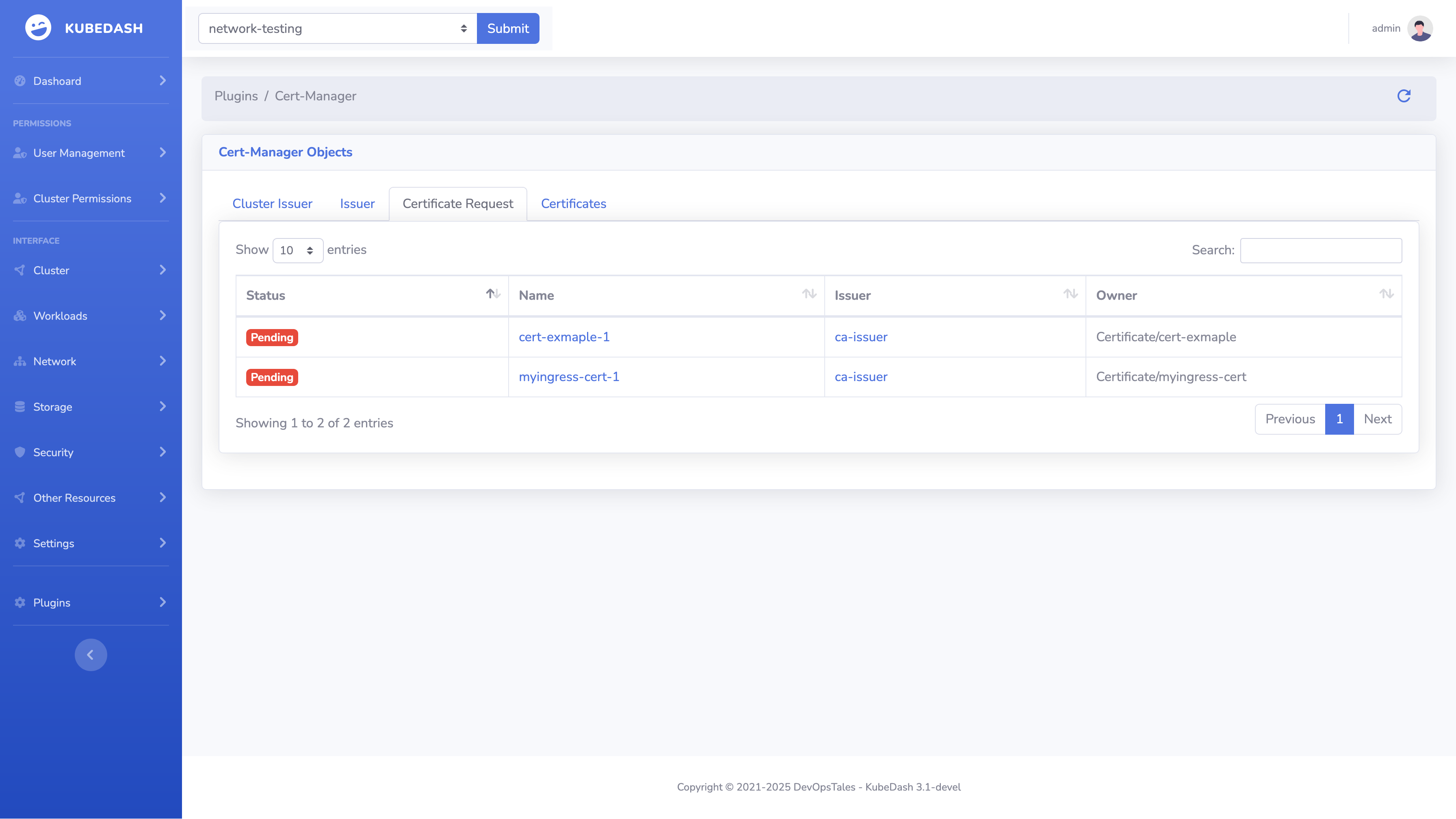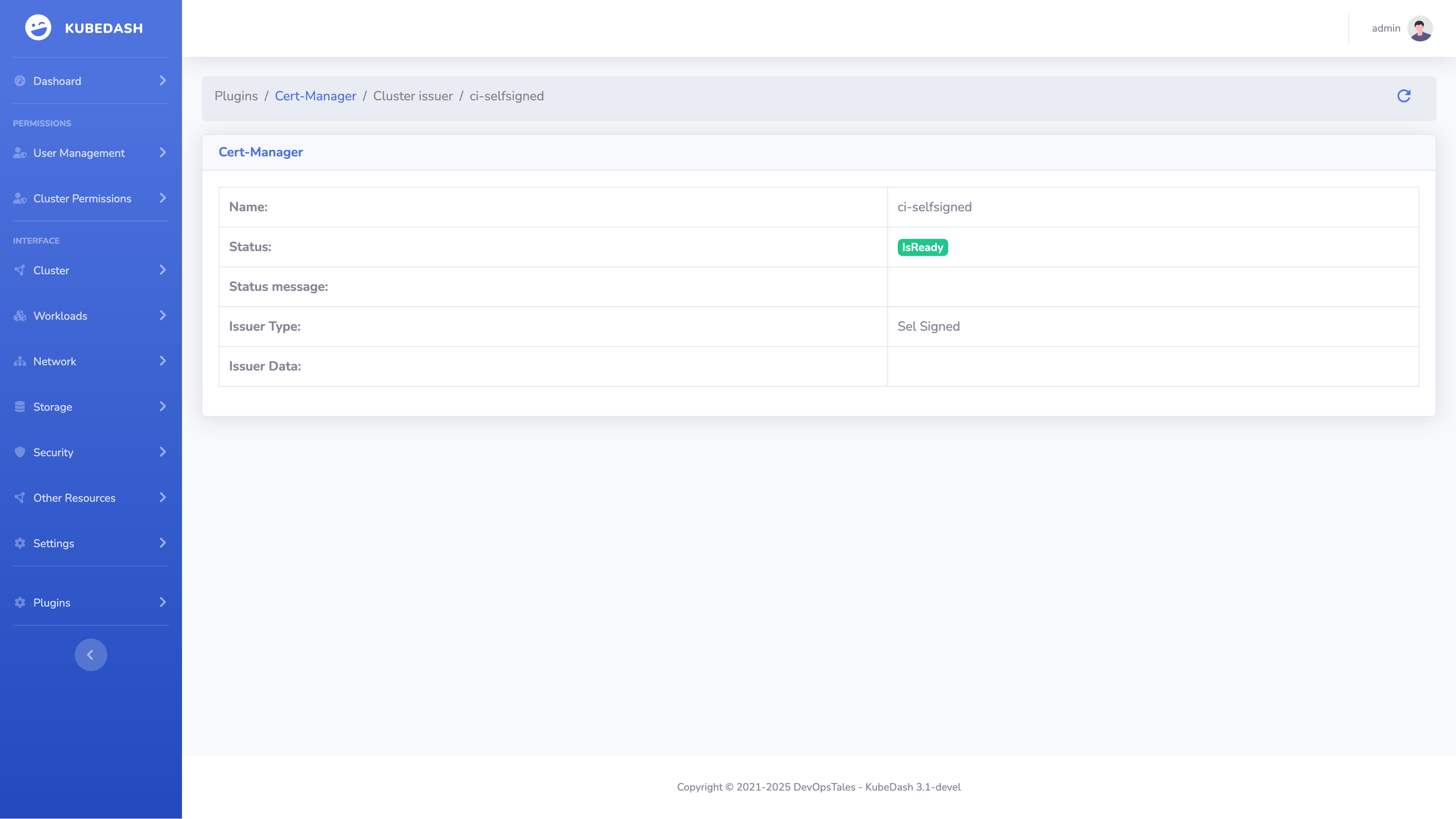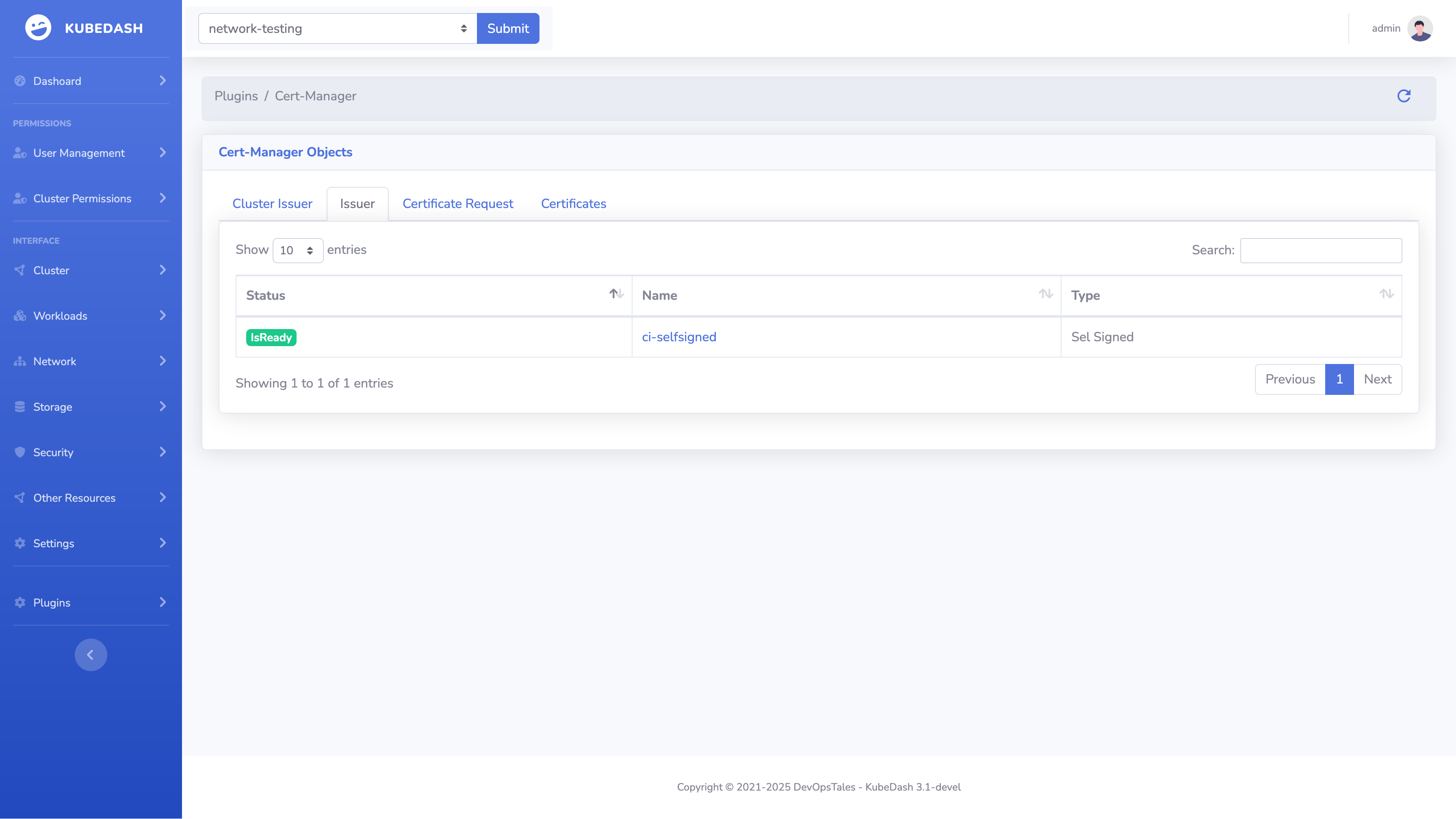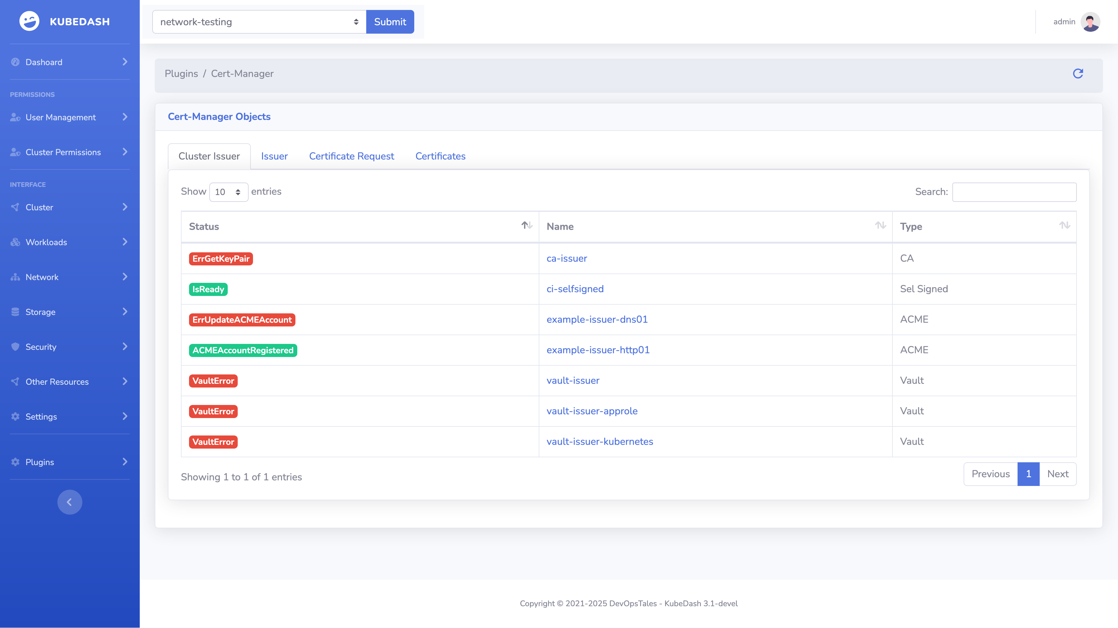 Cert-Manager Plugin Whit the KubeDatabase UI you can see your Cert-Manager Custom configurations and there sates.
